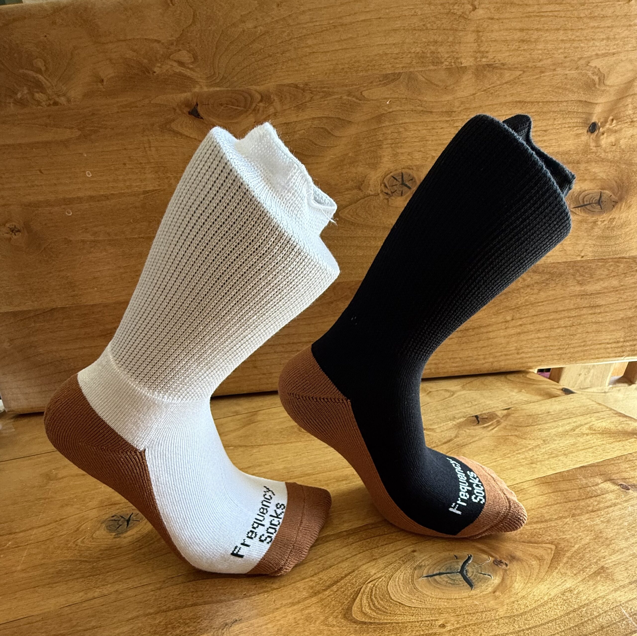 Our frequency socks are imprinted with a proprietary frequency blend. When our technology comes in contact with the skin through the water in your body it allows the body to operate more efficiently.